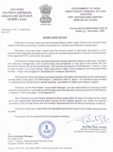DGCA ने इंडिगो एयरलाइन के अकाउंटेबल मैनेजर (सीईओ पीटर एल्बर्स) को शो-कॉज नोटिस जारी कर 24 घंटे के भीतर जवाब माँगा है कि हाल की बड़े पैमाने पर फ्लाइट रद्दीकरण, देरी और यात्रियों को सुविधाएं न देने के लिए उनके खिलाफ एयरक्राफ्ट रूल्स और सिविल एविएशन रिक्वायरमेंट्स के तहत कार्रवाई क्यों न की जाए।