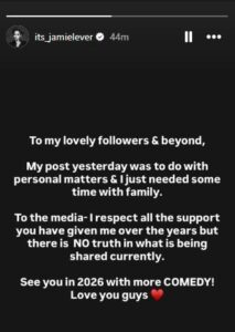 लगातार बढ़ती आलोचना के बीच जेमी लीवर ने अपने सोशल मीडिया अकाउंट पर एक पोस्ट शेयर कर ब्रेक लेने की जानकारी दी। इस पोस्ट में उन्होंने लिखा कि हाल की घटनाओं की वजह से वह मानसिक रूप से काफी परेशान हैं और उन्हें ऐसा महसूस हो रहा है कि वह खुद का एक हिस्सा खो रही हैं।