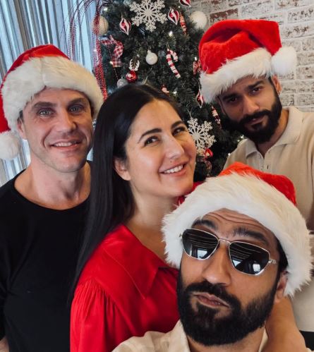 तस्वीर में सभी के सिर पर सैंटा हैट और पीछे क्रिसमस की सजावट सुंदर रूप से दिख रही है। कटरीना रेड कलर के आउटफिट में सुंदर लग रही थीं, और परिवार के साथ यह छोटी–सी सेलिब्रेशन का पल काफी खास रहा।