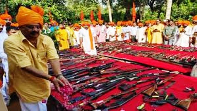 कुंडा से कई बार विधायक और जनसत्ता दल लोकतांत्रिक पार्टी के राष्ट्रीय अध्यक्ष कुंवर रघुराज प्रताप सिंह उर्फ राजा भैया ने अपने बेंती स्थित राजभवन में शस्त्र पूजन किया। लेकिन इस बार की पूजा ने सुर्खियां बटोरीं, क्योंकि एक लंबी मेज पर सजे करीब 700 से अधिक हथियार रखे हुए थे। जिसकी फोटो और वीडियो सोशल मीडिया पर वायरल हो रहे हैं। दरअसल, हर साल दशहरे पर राजा भैया शस्त्र पूजन की परंपरा निभाते हैं। इस बार भी बेंती महल में हनुमान जी की मूर्ति के सामने पुरोहितों के मंत्रोच्चार के बीच पूजा हुई। इस दौरान राजा भैया ने असलहों की पूजा की। एक वीडियो में राजा भैया खुद हथियारों को स्पर्श करते नजर आ रहे हैं, तो दूसरे में दर्जनों पिस्टल, रिवॉल्वर, 12 बोर बंदूकें, राइफलें और थर्टी कारबाइन जैसी आधुनिक असलहों की कतारें सजी दिख रही हैं।