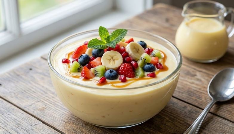 फ्रूट कस्टर्ड एक ठंडी मिठाई (डेज़र्ट) है, जिसमें दूध से बना क्रीमी कस्टर्ड और कटे हुए ताजे फल मिलाए जाते हैं। इसमें आमतौर पर सेब, केला, अंगूर, अनार, चीकू या स्ट्रॉबेरी जैसे फल डाले जाते हैं। दूध से कैल्शियम और प्रोटीन मिलता है, जबकि फल शरीर को जरूरी विटामिन और मिनरल्स देते हैं। इसी वजह से फ्रूट कस्टर्ड को एक हेल्दी डेज़र्ट भी माना जाता है।