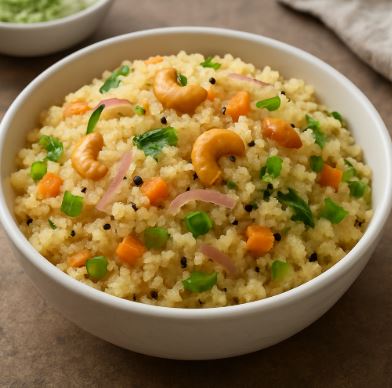 इसके बाद प्याज़, हरी मिर्च और कढ़ी पत्ता डालकर सुनहरा होने तक भूनें। चाहें तो इसमें काजू या मूंगफली भी मिला सकते हैं, जिससे तड़का और कुरकुरा बनता है। भुने हुए मसालों में सूजी डालें और हल्का भूनें ताकि सूजी की सुगंध बढ़े। अब धीरे‑धीरे उबले हुए पानी को मिलाते हुए लगातार चलाएं, ताकि कोई गांठे न पड़े। जब पानी सूजी में पूरी तरह से समा जाए और उपमा गाढ़ा हो जाए, तब गैस बंद करें। ऊपर से हरा धनिया और कद्दूकस नारियल डालकर सजाएं और गरमा गरम परोसें।
