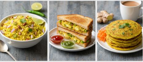 धुले हुए पोहे को हल्का गीला कर लें। कढ़ाही में तेल गर्म कर राई, करी पत्ता, हरी मिर्च और प्याज भूनें। इसमें आलू, मटर और हल्दी डालें। अब पोहा, नमक और थोड़ा नींबू रस मिलाकर हल्का सा पकाएं। ऊपर से मूंगफली और हरा धनिया डालकर परोसें। पोहा पचने में आसान होता है और इसमें कार्बोहाइड्रेट्स भरपूर मात्रा में होते हैं, जो दिन की शुरुआत के लिए ऊर्जा देते हैं।