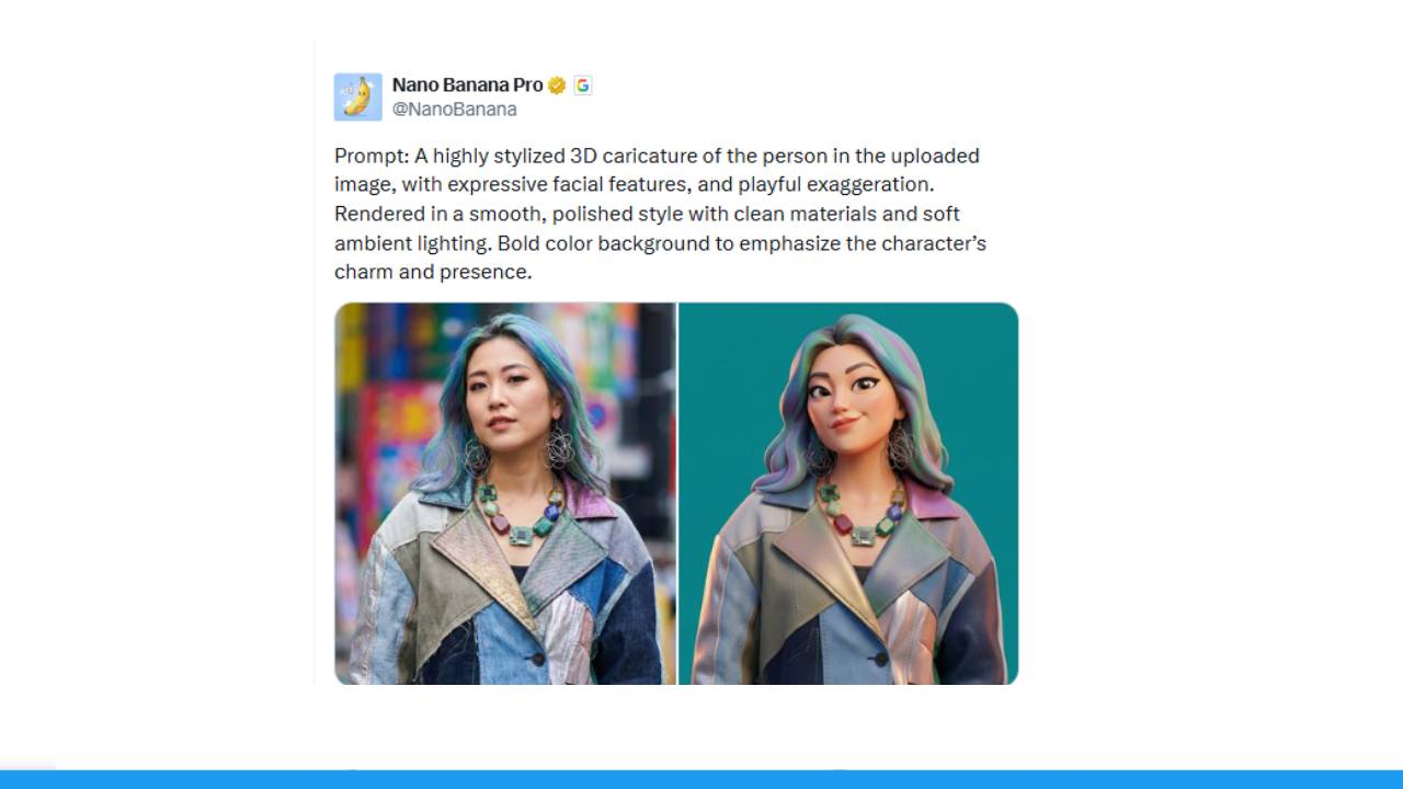Google ने हाल ही में Gemini Nano Banana Pro मॉडल के साथ एक नया वायरल ट्रेंड शेयर किया है, जिसमें लोग अपनी फोटोज़ को बेहद आकर्षक और स्टाइलिश 3D caricature में बदल रहे हैं। सोशल मीडिया पर कई यूज़र्स पहले ही इस ट्रेंड को आज़मा चुके हैं, और इसके मज़ेदार रिज़ल्ट्स को खूब पसंद किया जा रहा है।
