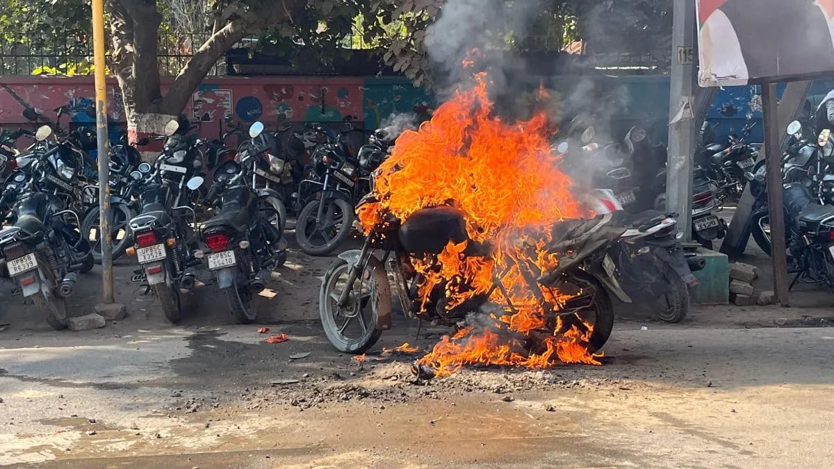 Bike fire in Mathura parking:सदर तहसील के ठीक सामने स्थित वाहन पार्किंग में शुक्रवार को उस समय खलबली मच गई, जब वहां खड़ी एक पैशन प्रो बाइक में अचानक आग लग गई। कुछ ही पलों में आग ने विकराल रूप ले लिया और बाइक आग का गोला बन गई। पार्किंग में मौजूद लोग दहशत में आ गए और आसपास खड़ी गाड़ियों को तुरंत हटाया गया।