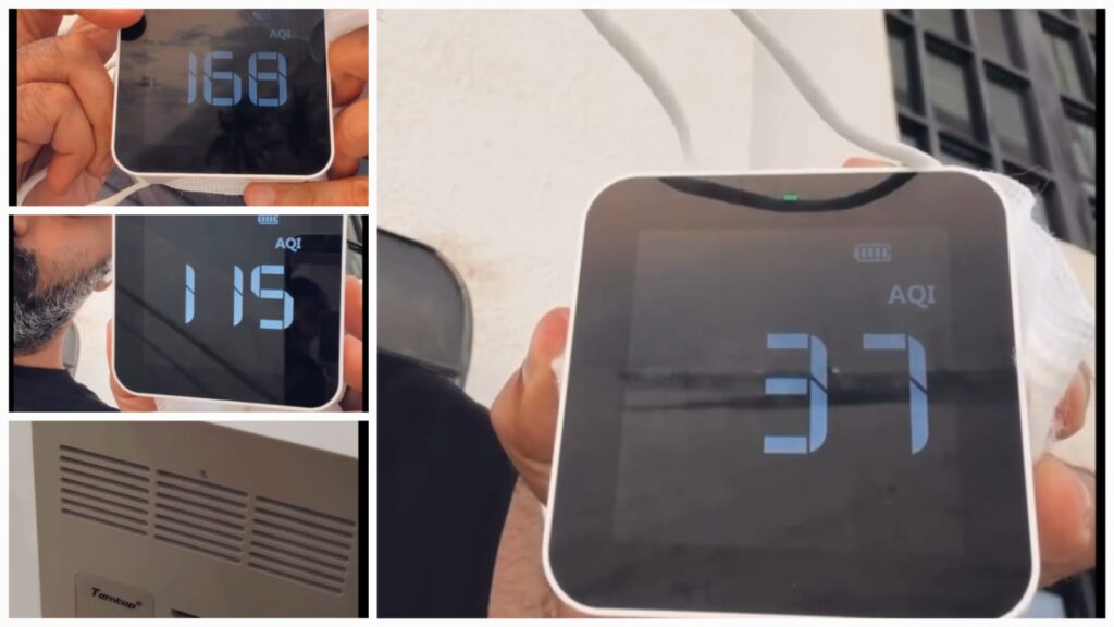 इस वायरल वीडियो में एक शख्स हवा की गुणवत्ता जांचने वाली मशीन यानी AQI मीटर से एक छोटा सा प्रयोग करता है। सबसे पहले वह मशीन को खुली हवा में रखकर जांच करता है। मीटर पर AQI का आंकड़ा 191 से 192 के बीच दिखाई देता है। वह व्यक्ति समझाता है कि करीब 200 AQI का मतलब है कि हवा साफ नहीं है और लंबे समय तक सांस लेना नुकसानदायक हो सकता है।